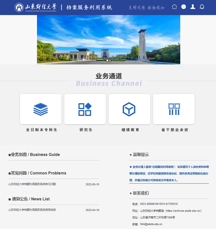 或通过“山东财经大学”“山东财经大学档案馆”“山东财经大学校友之家”“山财大就业指导处”等网站或微信公众号入口进入档案服务系统,并通过不同的业务通道提交查档申请。