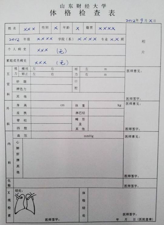 6、表格填写:参照模板(见附表1)认真填写个人信息并贴二寸彩照,查体当天携带查体表和化验单(病历用于日常看病)。