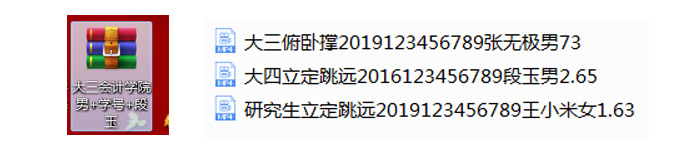 大三大四组及研究生组压缩文件夹名称为年级+学院+性别+学号+姓名+成绩,文件名称为年级+项目+学号+姓名+性别+成绩,具体格式举例如下: