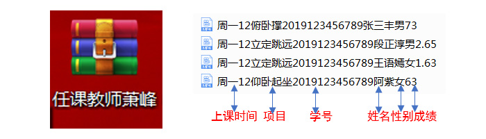 视频格式统一为*.mp4,大一、大二压缩文件夹名称为任课教师姓名,文件名称为上课时间+项目+学号+姓名+性别+成绩,具体格式举例如下: