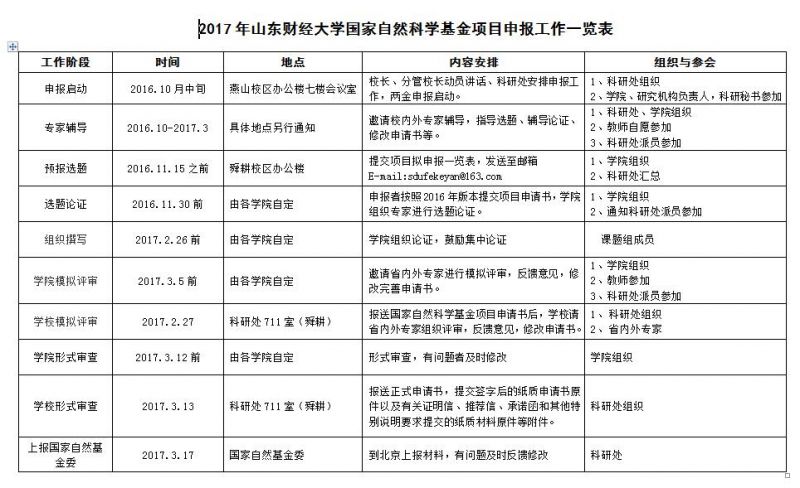 申请人最终完成申请书撰写后,在线提交电子申请书及附件材料,下载打印最终PDF版本申请书,并保证纸质申请书与电子版内容一致,于2017年3月13日将正式的申请书报送科研处,同时提交签字后的纸质申请书原件以及有关证明信、推荐信、承诺函和其他特别说明要求提交的纸质材料原件等附件。具体安排详见2017年山东财经大学国家自然科学基金项目申报工作一览表(见附表)。