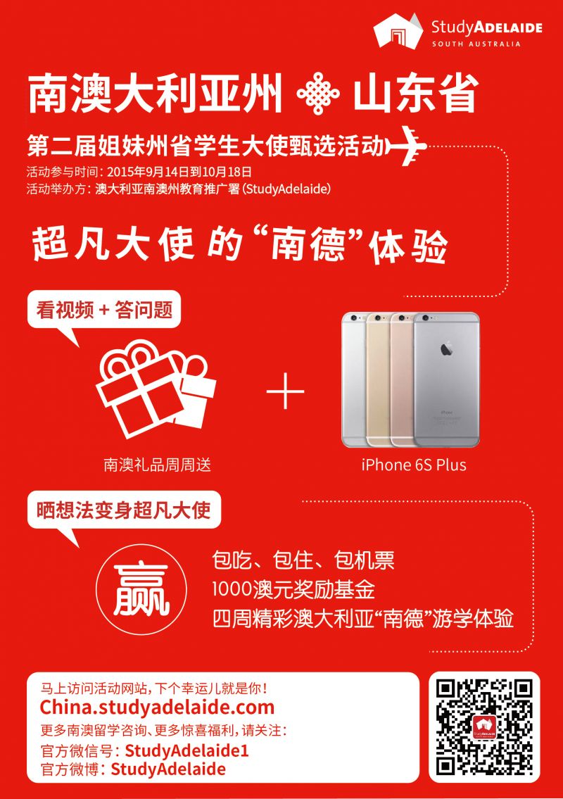 为庆祝山东省和澳大利亚南澳州将近30年的姐妹省州关系,南澳州教育推广局启动了第二届“超凡大使,南德体验—南澳州山东省姐妹州省学生大使甄选活动”。这次活动针对山东省全省的17岁以上学生(学生2016年7/8月时满18周岁),南澳方将从申请成为大使的学生中挑选两名优秀的学生代表,在2016年到阿德莱德进行四周的游学。期间,所有的费用(往返机票、住宿、课程等等)都将由南澳州教育推广局及其合作伙伴提供。