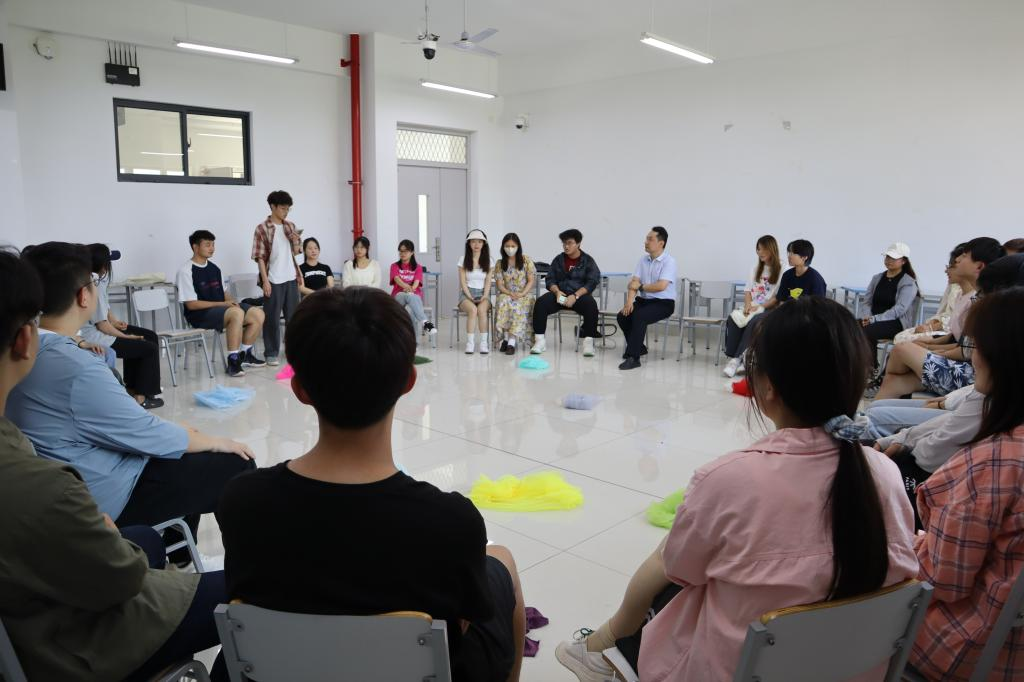 暖身活动——社会计量《家乡美》《相似圈》环节,刘洪涛组织同学们根据家乡的方位与省份站在不同颜色彩纱代表的位置介绍家乡,展示民族独特的语言以及各省份有代表性的地方特色表演形式。活动拉近了天南海北同学们之间的距离。