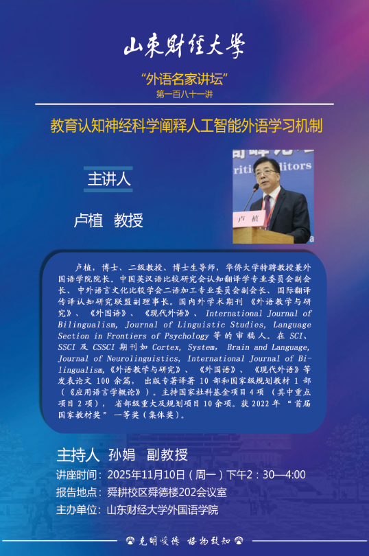 “外语名家讲坛”第一百八十一讲:教育认知神经科学阐释人工智能外语学习机制