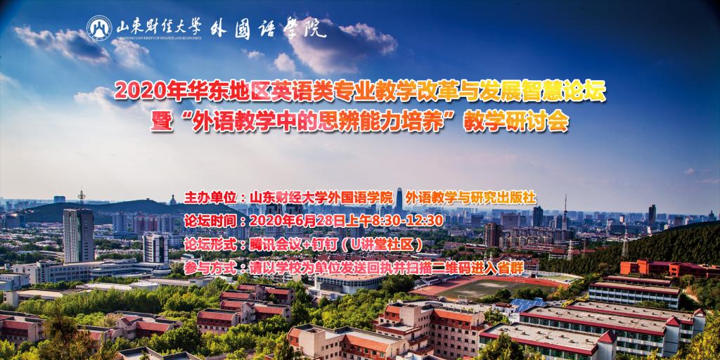 新时期英语专业人才培养应适应国家社会对英语人才提出的新需求,英语类专业教学应体现《高等学校外国语言文学类本科教学质量国家标准》和《高等学校英语类专业教学指南》要求,融合语言与知识学习,以能力培养为导向,重视语言能力、跨文化能力、思辨能力和自主学习能力的培养。在英语教学中提升学生思辨能力日益得到院校及教师的更广泛关注与更深入的思考。在这一背景下,山东财经大学外国语学院、外语教学与研究出版社将于6月28日举办“2020年华东地区英语类专业教学改革与发展智慧论坛暨‘外语教学中的思辨能力培养’教学研讨会”,特别邀请教育部高等学校外国语言文学类专业教学指导委员会委员、国内高校外语教学专家、华东地区外语院校院系代表,共同探讨英语专业教学实践成果和研究动态,提升英语教学水平,扩展英语教学维度,交流语言学习与思维提升融为一体的英语专业教学改革成果。欢迎各高校外语学院院长、英语专业负责人及骨干教师“慧”聚云端,共商专业发展,共议思辨教学!